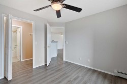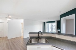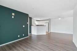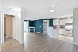 This exceptionally clean condo offers a welcoming layout from the moment you step inside. The entry opens into a spacious, open-concept living room featuring a cozy fireplace and direct access to the balcony, perfect for relaxing. The modern kitchen is bright and functional, complete with white cabinetry, roll-out drawers, generous counter space, and tile flooring. It connects easily to the dining area, which comfortably fits a dining table. The primary bedroom is a great size and includes a walk-in closet and private ensuite. The second bedroom works well for guests, family, or a home office. The main bathroom includes an accessible walk-in style tub/shower conversion designed for ease and safety. Tile flooring runs through the kitchen and bathrooms, with vinyl plank flooring throughout the rest of the home for a clean, updated look. A full laundry room adds everyday convenience, equipped with a full-size washer and dryer plus ample storage. Recent updates include newer windows and a newer patio door, and the assigned parking stall is located right at the front entrance for quick access. Set in the heart of Airdrie, this condo is close to shops, pathways, and parks giving you a comfortable low-maintenance living in a prime area of the city.