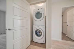 This condo is priced among the most affordable units in the complex. Welcome to this exceptional over 1,700 sq ft townhome in "The Elements of Nolan Hill" complex, offering contemporary style and a private setting backing onto single-family homes. Built in 2018, this quiet unit boasts a unique private front entrance, setting it apart from the rest of the complex. The main floor features an open-concept layout, seamlessly connecting the upgraded kitchen with sleek stone countertops and stainless-steel appliances to the spacious living and dining areas. A convenient half bath on this level adds to the functionality. Upstairs, you'll find two well-sized bedrooms, a four-piece main bathroom, and a generous primary bedroom complete with its own private ensuite. Throughout the home, enjoy the durability and modern aesthetic of luxury vinyl plank flooring and stylish tile. Step outside to your exceptionally sized balcony, perfect for entertaining or relaxing, and equipped with a natural gas line for your BBQ. The lower level provides direct access to the double-wide attached garage, along with a versatile den/flex room – ideal for a home office, gym, or media space. Location is key! This home offers incredible convenience, just minutes from Costco off Sarcee Trail and a vast array of associated shopping, restaurants, and shops. Enjoy easy access to major roadways, making your commute a breeze. This home is an ideal choice for first-time buyers or those looking to step up into a modern, low-maintenance lifestyle in a vibrant Calgary community. Don't miss this opportunity!