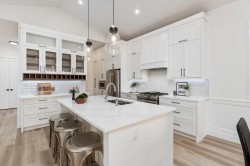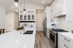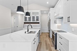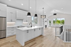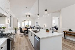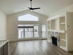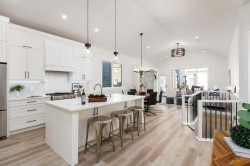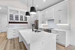 Welcome to your new home! With an estimated completion date of early 2026, this stunning, brand-new, WALK-OUT BUNGALOW by Marygold Homes comes complete with a TRIPLE CAR GARAGE as well as a FULLY FINISHED BASEMENT, back onto the pond and features over 2980 SQFT of total living space. Thoughtfully designed, this brand-new detached home in Mandalay Estates is located just minutes from downtown Carstairs, the Community Golf Course, Memorial Arena, Hugh Sutherland School, and within walking distance to a Loblaws grocery store which is right in the subdivision. The property's durable hardie-board siding exterior adds both functionality and curb appeal. Inside, the main floor space features 10-ft ceilings, vaulted ceilings in the kitchen and living room, 8-ft interior doors, 2 bedrooms, 2 full bathrooms, and CHROME PLUMBING FIXTURES. The home offers convenient garage access through a mudroom/laundry room equipped with built-in storage and a UTILITY SINK. The chef-inspired kitchen includes a large central island with dual-side storage, bar-style seating, STAINLESS STEEL KITCHEN APPLIANCES, soft-close shaker cabinetry and pull-out drawers, quartz countertops, a custom hood fan canopy, and a walk-in pantry. A stylish bar with glass cabinetry adds both character and function, and completes the kitchen layout. The kitchen flows into the dining area and then living room, where an entertainment unit with a tile-surround gas fireplace creates a warm and inviting space. A large transom window adds architectural charm and fills the room with natural light. From here, step out onto the deck which is finished with Duradek Lino and also comes equipped with a gas line, perfect for relaxing, entertaining, or barbeque get-togethers. The primary suite features sizable windows, a 4-piece ensuite which comes complete with a dual-sink vanity, separate water-closet, shower with built-in bench, and a walk-in closet with custom shelving. A second bedroom, 4-pc bathroom, and linen closet complete the main level. The fully finished walk-out basement adds on an ample amount of living space, with expansive windows, 9-ft ceilings, 7-ft passage doors, 2 additional bedrooms, a full 4-pc bathroom, a WET BAR, as well as a large recreation area—ideal for guests, extended family, or a home gym. Don't miss the opportunity to make this home your very own! **GST Rebate, if any, shall go to the seller. PLEASE NOTE: Property is Under-Construction (Estimated Completion: January 2026). Photos used of are of the same/similar layouts or previous projects and are for reference and illustrative purposes only. The Exterior Rendering is for illustrative purchasers only. Purchasers can choose interior selections at this time (Contact Listing Agent for more info).**