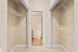 18+ living at its finest! Amazing home in a pet friendly, well managed, secure building with a healthy reserve fund! New carpets & new paint throughout give this 2 bed / 2 bath home a fresh new feel! Enjoy a main living area with maple kitchen, maple hardwood floor, S/S appliances, 9 foot ceilings, central A/C & cozy corner gas F/P. The primary suite has walk through his & her closets & a 3 piece ensuite. The good size 2nd bedroom, 4 pc main bath & in suite laundry room with ample storage space, complete the home. Spacious covered patio with view of a park is great for relaxing & very convenient for walking the dog(s). The extensive list of amenities includes a fitness center, guest suite, social room, meeting room, library, sauna, steam room, bike storage room & car wash bay. There is in suite storage plus an additional storage locker in front of your heated underground parking stall. Quiet location, close to walking/bike trails, parks, shopping, Anthony Henday & future Capital Line LRT station.