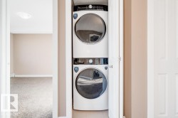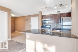 Price Improvement! Right in the heart of Heritage Valley Town Centre, this top floor 2 bedroom, 2 bathroom condo features south facing private balcony views, with abundant sunlight, and a elegant look throughout, with lush carpets to walk on and granite countertop surfaces. The primary bedroom is highlighted by a walkthrough closet to ensuite. The large den at the foyer is ideal for office space. Brand new in-suite stacked laundry, upgraded appliances and backsplashes, add to the charm of this unit, coupled with the convenience of heated underground parking and secure storage, as well as assigned additional parking near the entryway- 2 spaces in total! Steps from public transit, restaurants, shopping, medical services, schools, rec centers and more. The building is monitored for peace of mind with security cameras.