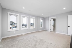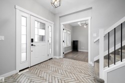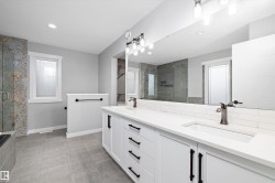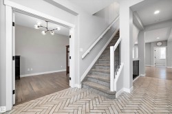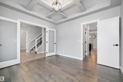 Gorgeous COVENTRY BUILT 2578+ sq. ft. TIMELESS 2 STOREY plus a TRIPLE GARAGE with a 693+ sq. ft. LEGAL SUITE UPSTAIRS featuring AC & a BALCONY! STUNNING HOME offers a large traditional foyer with PARQUET TILE FLOORS & FRENCH DOORS to either the lovely LIVINGROOM with COFFERED CEILINGS or the DEN with a 1/2 bath. The SUNLIT GREATROOM offers a GENEROUS DINING AREA & contemporary WHITE KITCHEN featuring a CONTRASTING ISLAND, STAINLESS APPLIANCES with DACOR GAS STOVE, European backsplash, QUARTZ COUNTERS, BUTLERS PANTRY, engineered HARDWOOD flooring & access to the BACK DECK & YARD. Up to the BONUS LOFT/COMPUTER AREA & 2 bedrooms WITH WI CLOSETS & a 4 piece bathroom. The primary features a SPA ENSUITE with SOAKER TUB, CUSTOM SHOWER & WALK THRU CLOSET into the handy LAUNDRY ROOM. The GARAGE offers a SPACIOUS SUITE BUILT BY COVENTRY, EXTRA INCOME $$$$ or SPACE FOR EXTENDED FAMILY. The BASEMENT is a BLANK SLATE ready for your own design. LOW MAINTENANCE YARD, AC, TIMELESS EXTERIOR & PERFECT LOCATION!