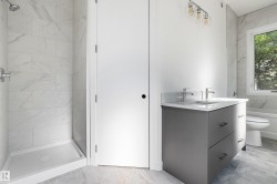 Amazing New Yorker/Colonial style, luxury new infill home close to Mill Creek Ravine. The spacious 2-storey home with 2604 sq ft projects timeless, thoughtful elegance. The stately facade has Hardie plank siding as well as large windows and a flat roof. Inside, the main floor opens dramatically onto a ceramic tile hallway with a a living room, and a flex room/2nd living room. A chef inspired kitchen with dining area with access to deck. On this level is a 4th bedroom and ensuite for guests, and a mudroom back entrance. Upstairs, the luminous primary suite with walk-in closet/ensuite. Two bedrooms with balconies face the back. A bonus room, 4-pc bathroom and generous laundry room complete the floor. The basement (9' ceiling) with separate side entrance is unfinished, waiting for your design. There is a deck & a double garage with 10ft ceiling. The home is mins bike ride to University of Alberta or downtown. Located in Old Strathcona, within walking distance to shops.