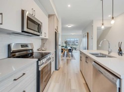 Step into a life of style and ease with this gorgeous, three-story townhome nestled in the highly sought-after Westmount, Okotoks community. Built by the trusted team at Slokker Homes, this property is your launchpad for modern living in a prime, family-friendly location. The bright, open-concept main floor is designed for seamless entertaining. You'll love the airy feel created by soaring knockdown ceilings and the flow of the durable vinyl plank flooring. The kitchen is a true showstopper: Quartz counters, high-end stainless steel appliances and chic, two-tone cabinetry with soft-close drawers. Upstairs, you'll find two generous bedrooms, including the relaxing primary suite with its own full ensuite bathroom. A well-placed laundry area on this level makes laundry a breeze. Location is everything, and this one delivers! Enjoy the security and convenience of an attached garage plus an EXTRA TITLED parking stall!. Your prime Westmount spot puts you steps from the Daily errands and weekend fun are simple with the Westmount Centre retail hub—offering essential shopping, dining, and services—just minutes away. This home beautifully blends sophistication, comfort, and unbeatable location, providing the perfect base for your vibrant life in the foothills.