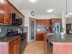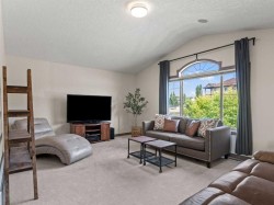 Welcome to this fully finished walkout 2-storey offering over 3,000 sq ft of living space designed for both comfort and lifestyle. Complete with air conditioning, a large garage, and a setting that backs onto greenspace and walking paths with mountain views and a park nearby, this home truly has it all. You’ll also enjoy exclusive lake access with year-round activities—swimming, fishing, paddle boarding, volleyball, basketball, and barbecues in the summer, plus skating in the winter. Add in a great school district and quick access to Calgary, just 15 minutes to South Calgary, and the location checks every box. Inside, you’re greeted by a grand entrance, where the main floor features 9-ft ceilings and hardwood flooring. A front office makes working from home easy, while the open living area offers a gas fireplace and large windows for natural light. The kitchen showcases a big island, dark stainless appliances, and flows to the dining area with access to a back deck where you can enjoy the greenbelt behind you. Upstairs you’ll find a vaulted bonus room and three bedrooms, including a large primary suite with mountain views, a walk-in closet, and a spa-inspired ensuite with a jetted tub, walk-in shower, and dual sinks. The fully developed basement adds even more living space with a big bedroom, full bathroom with shower, a wet bar with cabinets, and a large open rec space that walks out to the backyard. This home blends lifestyle, location, and family-friendly features in one complete package. Call your favourite Realtor to book your private showing—homes like this don’t last long!