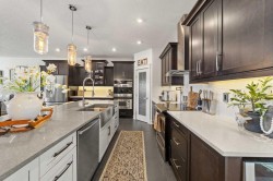 Welcome to this exceptional 5-bedroom luxury home, located on Harrison Green in the Olds Highlands. Situated on a generous lot with a beautiful central green space right out front, this property blends high-end finishes, thoughtful design, and an unbeatable location in one of Olds’ most desirable neighborhoods. From the moment you enter, you're greeted by a grand open staircase and elegant features throughout. The chef’s kitchen is the heart of the home—perfectly designed for entertaining and everyday living—with a large center island, full-size stove, wall oven and microwave, pot filler, wine fridge, and ample work space. There's also plenty of room for a large dining table, making it ideal for hosting family gatherings and dinner parties. Beside the dining area, a cozy, tucked-away family/TV room offers a perfect spot to unwind, separated by a double-sided fireplace that adds warmth and ambiance to both spaces. Enjoy total comfort in the 3-season east-facing enclosed patio room, perfect for morning coffee or evening relaxation. Step outside to a beautifully landscaped yard with a hot tub, rear shed with power, and a full irrigation system keeping the lawn green and lush. All five bedrooms feature walk-in closets, and the primary suite is a true retreat with a spa-inspired ensuite, including a freestanding tub and a double-sided fireplace shared with the bedroom—offering the perfect blend of comfort and luxury. The fully finished basement features in-floor heating, wet bar, a home theatre, and two large bedrooms—perfect for teenage children, guests, or visiting grandchildren needing space and privacy. Car lovers and hobbyists will appreciate the heated 4-car garage, complete with in-floor heat, a car hoist, air compressor with air lines throughout, and plenty of space for vehicles, tools, and toys. Additional highlights include a reverse osmosis water system, upgraded lighting, and premium finishes throughout. Don’t miss out on this incredible property that offers luxury, comfort, and room to grow in a prime location.