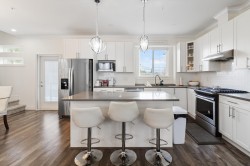 Open-house- Nov. 29th Sat. 12-2 pm. Stop renting and start owning! This stylish, like-new townhome offers a smart square layout with 3 spacious bedrooms, a versatile rec room, and 3 bathrooms, plus convenient street-level entry and rear access. Enjoy bright open-concept living with a modern kitchen featuring granite countertops, sleek cabinetry, and stainless-steel appliances, along with a balcony perfect for coffee, BBQs, and entertaining. The primary bedroom includes a walk-in closet and private ensuite, and two generous bedrooms complete the upper level. A fully fenced backyard provides great outdoor space, and this boutique community of only four homes on a 10,500 sq. ft. lot offers privacy, a self-managed strata, and low fees. — with no GST!