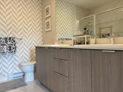 This rare 2-bedroom townhome offers the space and flexibility of a 3-bedroom layout, with nearly 1,400 sq.ft. of thoughtfully designed living space. The open-concept main floor is ideal for entertaining, featuring a large island kitchen with Caesarstone countertops, stainless steel appliances, double sinks, and sleek cabinetry. A sunken living room with soaring ceilings opens to a spacious sundeck overlooking the lush golf course. Upstairs, the king-sized primary suite boasts a walk-in shower with bench, double sinks, and stone counters. The oversized second bedroom offers potential to be divided into a third room. Recently updated with $18,000 in tasteful upgrades, including new entry floor tiles, laminate stairs, and designer wallpaper. Meticulously maintained and truly move-in ready.