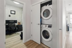 CHEAPEST 2 BEDROOM CONDO IN LANGFORD! Welcome to Utopia - modern living in the heart of the West Shore! This bright and well-maintained 2-bedroom (second bedroom/den has no window), 1 bathroom condo features an open concept layout with 9’ ceilings and durable laminate flooring throughout. The contemporary kitchen boasts new LG appliances, quartz countertops, a garburator, custom cabinet drawers with pull-outs, and a convenient breakfast bar. The spacious primary bedroom offers a walk-in closet and access to a 4-piece cheater ensuite with a tiled tub surround. Stay comfortable year round with efficient heating and cooling from the heat pump. Enjoy outdoor living on the generous patio—ideal for summer BBQs or quiet mornings with a coffee. This unit includes a secure parking stall and a separate storage locker. All within walking distance to shops, dining, grocery stores, parks, and much more—everything you need right at your doorstep!