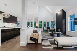 A completely redesigned FOUR bedroom + office, 4 bathroom duplex-style townhouse offering nearly 3,000SF of thoughtfully curated living. Soaring vaulted ceilings, skylights & wide plank hardwood floors enhance the open concept main floor, French double doors leading to a large PRIVATE fenced yard w/ built-in Weber BBQ island. Chefs kitchen fts. 10-ft quarts waterfall entertainers island, black oak cabinetry, ample storage, Jennair S/S appliances & a built in banquette. Stunning steel+glass staircase leads to 3 light filled bedrooms & an impressive primary suite with lofted office, vaulted ceilings, walk-in closet & ensuite w/ soaker tub, walk-in shower, double vanity and in-floor heat. Lower level includes a media room, gym, & a fully finished nanny suite w/ separate entry & 2 car garage.