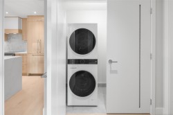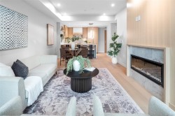 Discover 304 at Tiller & Grace — a refined west-facing 1-bedroom home built by GT Mann, renowned for exceptional craftsmanship. This spacious open-concept layout offers room for a dining table, plus a kitchen island with bar seating. The premium appliance package includes a WOLF induction cooktop and oven, panelled Fisher & Paykel fridge/freezer, and Fisher & Paykel drawer dishwashers—features rarely found in condos. Millwork by Harbour City Kitchens showcases rift-cut white oak veneer cabinets and solid birch dovetail drawers. Enjoy year-round comfort with air conditioning. A fully covered west-facing balcony extends your living space and is the perfect place to unwind in the afternoon sun. The bathroom features a double-sink vanity for added luxury. A beautifully crafted home ideal for a couple seeking quality and style.