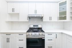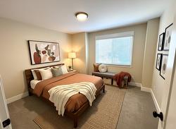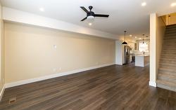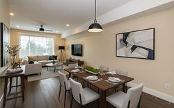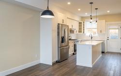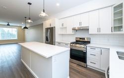 DRIVEWAYS with plenty of garage space welcomes you at Hillside Terrace, where 1567 sq/ft of tastefully designed living space awaits. The open concept main level features plank flooring throughout, and contains the living room, dining area, powder bath, and kitchen with shaker-style cabinets, quartz counters, and an 8’ sit-at island with spot for your beverage fridge. This level has a view out the front and walks out to your backyard which is privately fenced and includes artificial turf, patio space, and a small garden area to use as you wish; perhaps for vege’s, flowers, or shrubs (low-maintenance yards keep the strata fees lower). The upper level, with plush carpeting, consists of the primary bedroom with ensuite, a 2nd bedroom, a den/office, and the main bathroom. Additional 210 square feet in the garage is where you could have a media room, an office, he/she-cave, a storage room, or leave it open to accompany motor toys or a 2nd vehicle. Sound-proofed, gas heat, central air, window coverings, LG stainless fridge, gas range and dishwasher and a white Whirlpool stacker washer and dryer all included, making this exceptional value! Centrally located, to schools, recreation/events, shopping, restaurants, theatres, pet friendly.