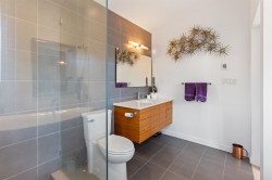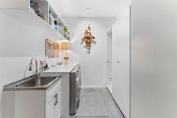 This stunning residence exemplifies design and construction where exacting standards were not just met, but exceeded. Thoughtful planning is apparent in every corner, creating a light-filled home with a comfortable layout and an incredibly efficient use of space. The home incorporates cutting-edge passive solar design, featuring large south-facing windows to maximize winter solar gain and strategic overhangs for summer cooling. A two-story concrete wall acts as a thermal mass, regulating interior temperatures, complemented by luxurious hydronic radiant heating beneath the polished concrete floors. Built with quality second to none, this home is truly designed to last. Adding to the value and flexibility is a semi-lofted legal suite, conveniently situated at the side of the house