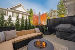 Luxurious and impeccably kept 1401 sq. ft three bedroom unit boasting 9-foot ceilings, a gourmet island kitchen with breakfast bar, high-end stainless steel appliances, and elegant quartz countertops. This exceptional residence offers a rare 2 pc powder room on the main floor, two generously sized bedrooms upstairs with ensuite bathrooms on the upper level, and a versatile bedroom/den space downstairs with direct access to backyard that backs onto peaceful greenspace. Step outside to the expansive 15' x 10'5 deck off the living room. Ideally situated in South Surrey adjacent to The Hills Golf Course and Noble restaurant, 2 blocks to Douglas Elementary School, close proximity to a regional mall, and an array of commercial and medical amenities.