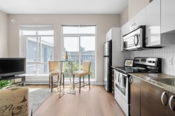 Top Floor 1-Bedroom with soaring 10ft ceilings & fresh upgrades! South-facing unit with floor-to-ceiling windows that fill the space with tonnes of natural light. Freshly updated with new vinyl plank flooring and paint throughout. Enjoy a peaceful view of the quiet courtyard from your living space. Amenities include a gym, courtyard with a kids' play area, and bike storage. 1 parking & 1 locker, EV -ready building & pet-friendly. Prime location with local businesses right at your doorstep. Just a 9-minute walk to Gateway SkyTrain Station for fast access to SFU, Central City Mall, parks, and more!