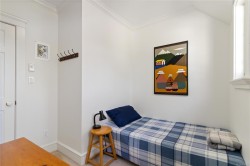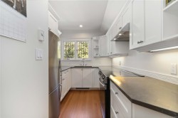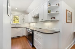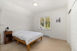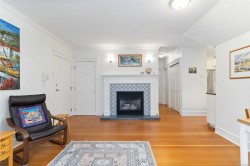 Welcome to The Aisling, a Samuel Maclure–designed residence built in 1911, during the same era he was designing some of his most famous Prairie-style homes in Rockland. Unlike those horizontal forms, this steep-gabled character home—later converted into seven suites—stands tall on the crest of Gonzales Hill and offers striking half-timbering and leaded glass details. Suite F is a one-bedroom plus den on the quiet rear of the building, surrounded by treetop views through large windows on three sides that make it feel like so much more than a typical condo. The bright den serves as your small second bedroom, office, or creative nook. Step outside and you’re just moments from Gonzales Beach, with Fairfield Village, cafés, and schools just a short walk away. A rare find for a character conversion, the building includes an elevator and parking roughed in for EV charging. This unique, light-filled, character-rich condo blends history, comfort, and location in one truly special home.