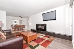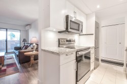Amazing opportunity at The Willows: Top floor, updated two bedroom unit with peek a boo ocean view from sunny west facing balcony. This home's updates include kitchen with white cabinets, stone counter tops, fixtures, stainless appliances. Marble flooring in entry way, laminate flooring in main living areas. Updated bathroom and air conditioning. Spacious living room with electric fireplace. Freshly painted interior including doors and baseboards. Within walking distance to shopping, doctors, banking & coffee shops. Free shared laundry on main level, no age restrictions, cats permitted! Enjoy all White Rock has to offer from this convenient location, visit the Pier, boardwalk, library and assorted restaurants and parks. Building offers an amenity room and common garden for residents.