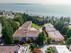 Exceptional value, don’t miss out! Welcome to Seapark Manor! This spacious 1244 sq. ft. corner suite in the heart of White Rock offers plenty of natural light and beautiful OCEAN VIEWS. Featuring 2 bedrooms and 2 bathrooms, both with walk-through closets and direct ensuite access. Enjoy hardwood floors, a bright large kitchen, in-suite laundry and 3 ceiling fans. Ground level access provides a large patio with garden views, private storage shed, side balcony with ocean views and easy lane access. Includes 1 secured covered parking stall, storage locker and ample guest parking. Quiet, well maintained community with gym, sauna, games and amenity rooms. Building updates: new windows, patio doors, balconies and new roof.