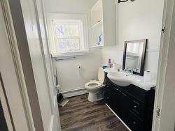 This cozy home Nestled in a serene park-like setting on a large 15,000 square foot lot, this 1100 square foot charming story and half offers a tranquil atmosphere perfect for relaxation. The property offers two upstairs bedrooms, an upstairs full bathroom featuring a deep soaker tub and shower unit, and a downstairs half bath/laundry room equipped with oversized laundry appliances with a nice size storage closet. The bright living room, with elegant light fixtures, flows seamlessly into the a spacious eat-in kitchen which is complete with four stainless steel appliances and an abundance of warm walnut upper and lower kitchen cabinets. Ample counter top space allows for convenient meal preparation. As you enter the kitchen from the side door, a large walk in closet provides a spacious place to keep outdoor jackets and footwear organized and stowed out of site when not in use. The kitchen also has a 9 foot built in food pantry with shelves adjacent to the refrigerator. The outdoor electric hot water tank and oil furnace as well as the 8 x 10 storage shed provide additional storage. The home is kept warm and cozy with a heat pump and oil baseboard for back up. The heat pump also provides refreshing air conditioning during the hot summer months. The private deck off the kitchen offers a peaceful setting for morning coffee or evening barbecues. The large town lot is a natural beauty, complete with diverse tree species, birdlife, and wildlife, which creates a serene atmosphere. The deck extends into a secure chain-linked area, ideal for small children and pets. This cozy home is efficiently heated by a heat pump, with oil serving as a backup heating source. The property utilizes the town of New Glasgow's municipal services.