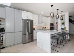 Step into luxury in this bright 2-bedroom, 2.5-bathroom suite! This southwest-facing executive penthouse features soaring two-story windows that flood the space with natural light and offer fabulous views across the city as well as an airy, fresh ambiance throughout. The main floor living space is stunningly updated with white oak floors, quartz countertops, built-in media and bar areas, and is designed for you to entertain in style or relax in an extremely comfortable and beautiful environment. Other main floor features include double closets at the front entry, a storage room or pantry space off the kitchen, and a handy 2pc main floor bath. The 2nd level hosts a spacious primary suite that includes an ensuite with a separate shower and tub, as well as a walk-through closet creating a perfect private retreat. The 2nd bedroom, full main bath, reading nook, and laundry room. Premium building amenities include a fitness centre, private theatre, party room, boardrooms, and a rooftop BBQ terrace with panoramic city views — ideal for summer evenings and gatherings. Experience penthouse living at its finest all just steps from Victoria Park, top dining spots, transit, hospitals, and the best of downtown entertainment.