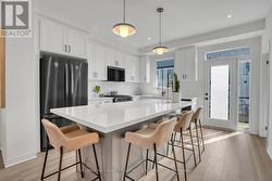 A STANDOUT NEW-BUILD WITH HIGH-END FINISHES, A STATEMENT KITCHEN & ELEVATED UPGRADES! Set within the Townes at Deer Springs by Honeyfield Communities, this standout new build commands attention with its brick-and-vinyl exterior, matte black keypad entry, and fenced backyard designed for relaxed evenings and effortless entertaining. Natural light pours through an open layout enhanced by 9 ft smooth ceilings, modern trim, sleek railings, oak-finish stairs, and upgraded water-resistant laminate and tile flooring that create a crisp, contemporary atmosphere throughout. The statement kitchen anchors the space with tall uppers, designer two-toned cabinetry with a contrasting island, Caesarstone quartz countertops, an undermount sink, full-height tiled backsplash in a brick pattern, under-cabinet valance lighting, pot lights, and a generous island that naturally draws people together, supported by a 6-piece appliance package tailored for seamless hosting. Upstairs, the primary retreat offers a calming escape with a walk-in closet and a beautifully finished 4-piece ensuite featuring a frameless glass shower and a Caesarstone quartz vanity, while two additional bedrooms share an upgraded 4-piece bathroom with a frameless sliding tub door and refined tilework. The lower level adds flexibility with a French-door office and walkout to the deck, paired with a main-floor powder room and smart laundry setup that keeps daily life running smoothly. Two balconies with glass railings invite slow mornings and sun-soaked evenings, while the oversized garage and driveway add everyday ease. A low monthly fee covers key maintenance, leaving more time to enjoy nearby parks, schools, dining, golf, and the community centre that keeps the lifestyle feeling connected and vibrant. (id:27)
