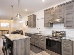 This 2017 open concept 1+2 bedroom bi-level + 3 bathrooms. Attached garage all granite + stainless kitchen with island + dining room onto patio doors to deck with fenced yard, all bathrooms granite top vanity... luxury finished throughout. Primary bedroom with walk-in closet + ensuite, air conditioning high ceilings in lower level. Rec room could put a 4th bedroom. Great location, close to shopping + parks, schools...
