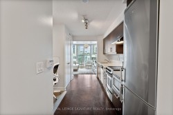Welcome to Suite 718 at The Modern. Step into a bright and functional 1+den layout featuring a galley kitchen with stainless steel appliances overlooking the open-concept living area. The spacious living room is framed by floor-to-ceiling windows and a Juliette balcony, filling the space with natural light. The bedroom sits just off the living room with sliding glass doors and closet. Enjoy world-class building amenities including a rooftop garden with BBQ area, two plunge pools with cabanas, a party room, bar and billiards, fitness centre, yoga studio, steam room, 24-hour concierge, and visitor parking. Conveniently located with TTC at your doorstep and just a short walk to St. Lawrence Market and the Distillery District.