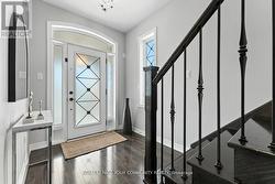 Welcome to this stunning executive home, showcasing luxurious upgrades and contemporary finishes throughout. Featuring soaring 9 ft ceilings and an open-concept design, this residence is enhanced by rich dark-stained hardwood flooring, elegant pot lights, and a striking fireplace with a custom floor-to-ceiling quartz surround. The chef-inspired kitchen boasts quartz countertops with a dramatic waterfall edge, a Calacatta marble and glass mosaic backsplash, under-cabinet lighting, premium maple cabinetry, and stainless-steel appliances. Step outside to professionally landscaped front and rear yards, complete with a stone patio perfect for entertaining or relaxing in style. (id:7525)