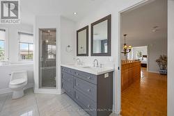 Welcome to 57 Turning Leaf, Sonoma Heights. This charming 3 bedroom, corner lot is nestled on a quiet, private street directly across from a peaceful pond, offering a serene and tranquil setting in the heart of Sonoma Heights. Step inside to a bright, open concept main floor, featuring a spacious home office and a modern eat-in kitchen with walk-out access to a large, fully fenced yar complete with gazebo and shed - perfect to outdoor entertaining. Upstairs, the primary bedroom retreat boasts a beautifully renovated ensuite with a glass shower and luxurious soaker tub. The finished basement offers additional living space ideal for entertaining or can serve as a comfortable in-law suite. Located within walking distance to shops, transit, schools and parks, this home offers both convenience and comfort in one of Vaughan's most sought-after communities. (id:7525)