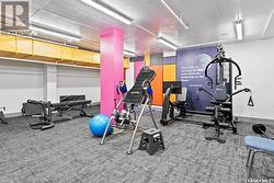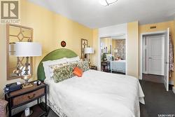 Fantastic 2 bedroom condo in the heart of downtown Saskatoon. Enjoy some of the city's nicest sunsets from this west facing suite. Quiet concrete building, open floor plan, with high end finishes. Porcelain tile flooring, granite countertops, maple cabinets, stainless steel appliances, 4 piece bath with tiled backsplash, customized built in maple cabinetry and bookshelf, french doors to office space/bedroom, and more! Unit comes with central air, in-suite laundry & storage space with bonus shelving, balcony off the large living space, and an exclusive electrified surface parking stall. Condo fees include water, heat, & power! Building common areas include shared laundry on each floor, amenities room, gym area, east & west facing rooftop terraces. Walking distance to the University, River walking trails, Kinsmen Park, Shakespeare on the Saskatchewan, Hospitals, public transit, and all amenities! (id:27)