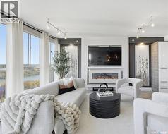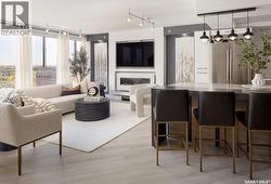 Experience Downtown Saskatoon Penthouse Living with an amazing View of the River! Indulge your desire for high-end, maintenance-free living with this breathtaking 1,528 sqft Penthouse Condominium in the vibrant core of Saskatoon. Far more than a home, this is a lifestyle defined by convenience and sophistication, boasting an enviable Walk Score of 96 and a Bike Score of 99. This professionally renovated sanctuary is a testament to modern design. The stunning kitchen is a chef's dream, featuring upgraded appliances, sleek quartz countertops, and a generous island with a sit-up bar that flows seamlessly into the main living space. The entire unit has been elevated with modern flooring, designer paint tones, and updated light fixtures, culminating in the removal & replacement of the dated ceiling for a smooth, contemporary finish. Designer touches by Fresco Interiors, including but not limited to custom drapery, add a final touch of tailored elegance. Upgraded blinds throughout give you privacy when you want it most. Step outside and immerse yourself in the city's best. You are mere steps from the 60 km of trails in the serene Meewasin Valley. Enjoy cultural gems like the Remai Modern, Persephone Theatre, and the charming seasonal Shakespeare on the Saskatchewan. Every amenity—from fine dining and popular taverns to museums and nature parks—is just a short, pleasant stroll away. The Terrace amenities redefine community living, offering a large facility with a swimming pool, hot tub, sauna, an adjacent indoor lounge, and an expansive outdoor patio with community barbecues. For an even more spectacular experience, retreat to the rooftop patio for breathtaking, panoramic city views. Your exclusive, heated covered parking spot means you can safely forget about your vehicle and embrace urban life. Don't just move... move up! Call today for a private viewing of this affordable, classy, and perfectly located penthouse on Fifth Avenue. (id:27)