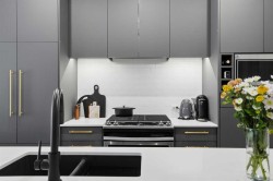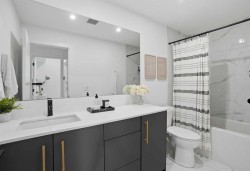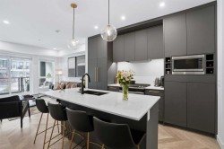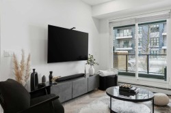 Step into contemporary living in one of Calgary’s most sought after urban communities, the award-winning UNIVERSITY DISTRICT. This beautifully crafted TWO bedroom, one bathroom home offers stylish functionality and the rare benefit of a PRIVATE GROUND LEVEL ENTRANCE, creating the perfect blend of convenience and comfort.Inside, the thoughtfully designed layout welcomes you with soaring 9 foot ceilings, oversized windows with custom blinds, and a bright open-concept living area ideal for everyday living or hosting friends. The kitchen stands out with sleek quartz counters, full height soft close cabinetry, paneled appliances, a gas range, designer pendant lighting, and a large island that doubles as a casual dining space.Both bedrooms are spacious and versatile, whether used as sleeping quarters, a home office, or a guest room. The closets have been customized by CALIFORNIA CLOSETS, with full warranty remaining. The bathroom is elegantly finished with modern tilework and premium fixtures. Enjoy the everyday ease of in suite laundry with full sized washer and dryer. Luxury vinyl plank flooring throughout reinforces the home’s modern aesthetic and durability.A highlight of this unit is the expansive covered patio with a gas hookup, perfect for outdoor dining, relaxing mornings, or entertaining year-round, all with effortless access thanks to the street-front walkout design.Esquire by Truman Homes offers exceptional resident amenities including a fully equipped fitness centre, bike storage and repair stations, and the building is professionally managed for peace of mind. A titled parking stall in the heated underground parkade, and an independent storage locker are also included.Live just steps to an incredible mix of shops, cafés, fitness studios, dining, and entertainment. Grab groceries at Save-On-Foods, sip at Monogram Coffee, enjoy brunch at OEB, or catch a movie at Cineplex VIP – all without getting in your car. Endless green spaces, dog parks, and the Bow River pathway network elevate your outdoor lifestyle. Plus, the University of Calgary, Alberta Children’s Hospital, Foothills Medical Centre, and Market Mall are moments away, with quick transit or driving access to downtown.Offering professional appeal, a walkable lifestyle, and refined finishes throughout, this home is the ultimate choice for first time buyers, downsizers, and savvy investors alike. Welcome to University District living at its finest.