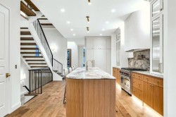Discover this luxury 3-storey detached home in historic Inglewood — where timeless elegance meets modern design. Built by Levant Homes in collaboration with Aly Velji Designs, this 4,872 sq.ft. masterpiece showcases meticulous craftsmanship, designer finishes, and thoughtful innovation throughout.Situated on a 33-ft south-facing lot backing onto the Bow River, this home blends curb appeal with architectural presence — Large Lux windows, full-bed brick, cedar soffits, and an aged concrete patio with built-in planter. It’s equipped with an elevator and Control4 smart home automation, combining sophistication with modern convenience.Inside, 10-ft ceilings create a light, refined atmosphere. The MAIN level features a formal dining room, custom wet bar pantry, and a warm living space anchored by a custom Urbana fireplace. The chef’s kitchen impresses with marble counters, bespoke cabinetry, and a full Wolf/Sub-Zero appliance package — including a 48” gas range, built-in steam oven, 3x under-counter fridges, and wine cooler.Upstairs, the PRIMARY suite exudes sophistication, featuring a matching double-sided Urbana fireplace, custom walk-in closets, and a spa-inspired ensuite with Calacatta Viola marble, a steam shower, his-and-hers sinks, soaker tub, and heated bench & floor. Two additional bedrooms each offer private ensuites and walk-in closets.The top-floor LOFT stands as the home’s defining feature — with downtown skyline views from the front balcony and peaceful river views from the rear patio. Designed for work and leisure, it combines a versatile rec space with another bar, office or study, and a full bath.Downstairs, the BASEMENT offers the perfect retreat for those long days — a built-in media centre, a gym, wet bar with wine cooler and beverage fridge, a steam-shower bath, and a comfortable guest suite.Enjoy the best of Inglewood at your doorstep — Rouge, The Dean House, Spolumbo’s, Lina’s, the farmers market, RiverWalk, and more. With new home warranty, this home defines elevated urban living.Book your private showing today.