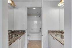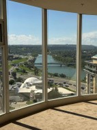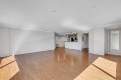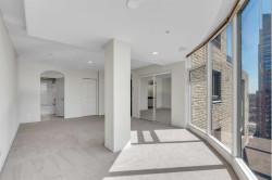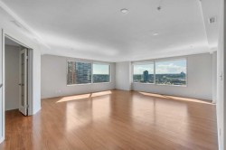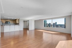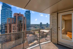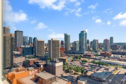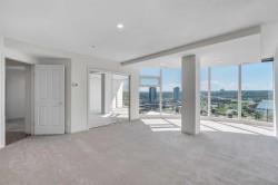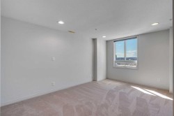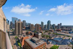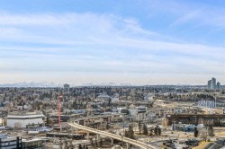 Unparalleled, Spectacular PANORAMIC VIEWS of the mountains, Bow River, and sparkling city lights! This nearly 1,600 sq. ft. luxury condo offers 2 bedrooms plus a den, 2 full baths, and 2 secure titled, underground parking stalls. Beautifully updated with hardwood floors, new carpet, fresh paint, and custom window coverings. Expansive windows fill the open living space with natural light, highlighting the raised panel cabinetry, granite countertops, pot lighting, and quality finishes throughout. Enjoy year-round comfort with full air conditioning and the sought-after south and west exposure. Ideally located in West Downtown with the Kerby LRT station right at your doorstep, and just steps to Shaw Millennium Park, river pathways, and all the conveniences of the city. Easy in-and-out access to downtown makes this the perfect urban retreat. This is the place to "right-size"!