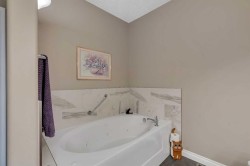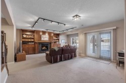 RARE OPPORTUNITY to own this immaculate 55+ walkout bungalow-style villa backing directly onto greenspace—with no neighbours behind! Tucked into one of the best locations in the community, this home is ideal for empty nesters and downsizers seeking a low-maintenance lifestyle without sacrificing space or comfort. From the moment you step inside, you’ll notice the executive upgrades including 9’ ceilings, custom crown moulding, and hardwood flooring throughout the main level. The layout is bright and functional with a spacious tiled front entry, a front den/office with large windows, and a formal dining area perfect for hosting. The kitchen offers granite countertops, corner pantry, an updated tile backsplash, and newer stainless-steel appliances including a fridge with water and ice, dishwasher, and microwave hood fan. The adjacent eating nook showcases unobstructed greenspace views and leads to the deck—a perfect spot for morning coffee or quiet evenings outdoors. The living room is warm and inviting and includes a three-way fireplace. The primary suite is a great size and features a walk-in closet and a beautifully updated ensuite with heated floors, a tiled shower and Jacuzzi tub. The main level is complete with a powder room and convenient laundry with new washer and dryer (2024). Downstairs, the walkout lower level expands your living space with a large family room featuring a gas fireplace, built-ins, a spacious additional bedroom, and a full bathroom. There’s also a versatile room that is ideal for an office, hobby space, rec room, or potentially an additional bedroom plus plenty of storage. Additional highlights include air conditioning, and a central vacuum system. Best of all: no condo fees—just a low $180 HOA fee covering lawn care, snow removal, and irrigation, making this an ideal turn-key option for those looking to simplify and enjoy life. With easy access to Stoney Trail, shopping and amenities this move in ready villa is not to be missed!