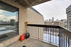 Welcome home to this SOUTHEAST FACING, RENOVATED, TOP FLOOR condo in B & H TOWERS conveniently located close to transportation, restaurants, coffee shops, shopping, the river valley/walking trails, MacEwan University & quick access to the U of A, Brewery & ICE Districts. This OPEN CONCEPT, BRIGHT condo has a gourmet kitchen with an oversize island with room for an eating area & an area for preparing your meals. This upgraded kitchen has Kitchen Craft espresso color cabinetry with soft close cupboards & drawers with lots of room for storage. The spacious living room can be split into two separate rooms because of the abundance of space. The sunny, south balcony can be your garden oasis with all the light. The 2nd bedroom & primary suite have views of Downtown. There is a sink in the primary suite for convenience. 4 piece main bathroom with a new toilet, pedestal sink & tub surround. Luxury vinyl plank flooring throughout & new baseboards. INSUITE LAUNDRY. Shows very well.