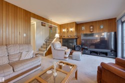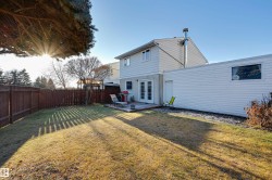 Attention in sought after Millbourne Green is this wonderful 4 bedroom, 2 bath, finished basement, and double garage home, which has been cared for by long-time owner. An inviting Air-Conditioned two-story townhouse with a spacious main floor perfect for entertaining. Bathed in natural light, creating a warm, welcoming atmosphere. The main floor boasts an updated kitchen with a tile backsplash, alongside a spacious LR with a cozy wood-burning fireplace that overlooks a large backyard. A half-bath and roomy foyer round out the first floor. Upstairs, you'll find four bedrooms, and a full bathroom with a jetted tub. The basement offers a large family room ready to have flooring installed and plenty of storage. The large back yard offers a deck, a gas line hook-up, and is perfect for relaxation. Conveniently located near trails, schools, and public transit, this home is ideal for comfortable living with easy access to local amenities, Whitemud, and major arterial roads. A lovely home in a wonderful location.