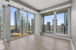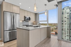 Experience elevated urban living in this stunning 31st-floor condo at the prestigious Encore Tower. Perfectly positioned in the vibrant downtown core, you're just steps from the Ice District, 104th Street, and some of Edmonton’s finest dining and entertainment. Step inside to be greeted by floor-to-ceiling windows offering breathtaking north to south panoramic views, capturing the beauty of west-facing sunsets and the glittering city skyline. The modern chef’s kitchen boasts sleek finishes, high-end appliances, and seamless flow into the open-concept living area—ideal for both relaxing and entertaining.This luxurious unit features 2 spacious bedrooms and 2 pristine bathrooms, all complemented by your own private balcony to take in the views. Residents of Encore Tower enjoy exclusive access to premium amenities including a fully equipped private gym, a stylish social lounge, and a beautifully situated 4th-floor outdoor terrace overlooking downtown Edmonton. Live in sophistication, style, and comfort!