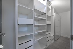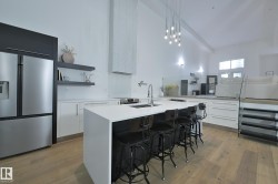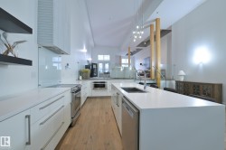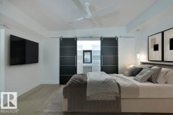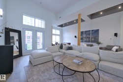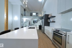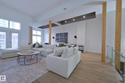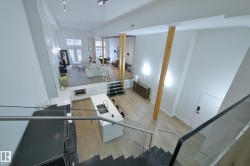 A very rare opportunity to own the PENTHOUSE suite in the sought after Morris Lofts, located in the heart of downtown Edmonton. Like nothing you've seen before, renovated from top to bottom, this home is absolutely spectacular. The bright & airy floor plan is flooding with natural light, hardwood floors, & soaring 24 foot ceilings that will take your breath away upon entry. Every detail of this home is well thought out creating the perfect layout. Offering a large storage room, laundry room, space for an office, pool table or workout space, living & dining space. Kitchen features 8 foot island w/ waterfall quartz countertops, expanding around the exterior allowing for tons of storage & counter space, custom tiled hood fan rising 12 ft, s/s appliances and custom cabinetry. The open glass riser staircase leads you to the luxurious suite with a lrg walk in closet, & tiled en-suite. Enjoy your summer evenings on your covered balcony which offers a view 104th street market & the sunset.