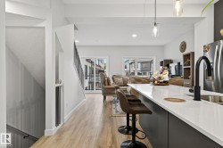 First time home buyers!! Welcome to Desrochers! This meticulously Maintained 3-storey townhome offers 3 bedrooms, 2.5 bathrooms, a double attached garage, and a fully fenced yard for privacy and peace of mind. Step inside to 9 ft ceilings that create a bright, open feel, complemented by quartz countertops, upgraded finishes, and stylish railings throughout. The modern kitchen flows effortlessly into the dining area with direct access to a spacious balcony—perfect for morning coffee, summer BBQs, or simply unwinding after a long day. Upstairs, the primary suite features a sunlit ensuite and a generous walk-in closet. You’ll also appreciate the second-floor laundry, a convenient linen closet, and the versatile flex room on the main level—ideal for a home office, workout space, or guest area. Enjoy truly maintenance-free living. Located just steps from Dr. Anne Anderson High School, the Community Centre, parks, trails, and everyday amenities, this home delivers comfort, convenience, and modern