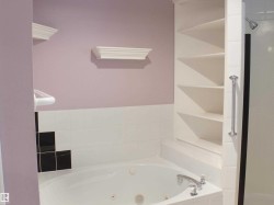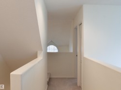 Just steps from the Mill Creek Ravine, this 2½ storey half duplex offers exceptional space and versatility! The main floor features a cozy living room with fireplace and large windows, a dining area open to the second floor, a bright kitchen with attached home office space, and a convenient 2-pc bathroom. Upstairs, you will find 2 bedrooms including a large primary ensuite with separate shower stall and a jetted tub. The third floor boasts a spacious family room — perfect for relaxing or entertaining. The finished basement offers even more living options with a den and large walk-in closet, 4-pc bath, second kitchen, small family room, laundry area and utility/storage room. Enjoy outdoor living on the deck and extra storage in the alley-accessed detached double garage with attached shelving. Ideal location near trails, parks, Bonnie Doon Mall, many great area restaurants and amenities!