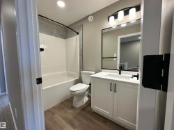 IMMEDIATE POSSESSION is available on this newly built 2-storey Alquinn home in Fort Saskatchewan. The modern open-concept design features 9-foot ceilings and a bright, inviting living space highlighted by an electric fireplace. The kitchen is thoughtfully designed with a breakfast bar, pantry, stainless steel appliances, and generous cabinetry for everyday functionality. A rear mudroom with built-in cubbies, main-floor 2-piece bath, and separate side entrance add practical convenience. Upstairs, the primary suite offers a walk-in closet and a 4-piece ensuite, complemented by two additional bedrooms, a second 4-piece bathroom, and convenient upper-floor laundry. Ideally located close to shopping, schools, parks, and other amenities, this home offers comfort, functionality, and modern finishes throughout. UPGRADES INCLUDE: electric fireplace, 9-ft basementceilings, stainless steel appliances, upper-floor laundry, mudroom with cubbies, separate side entrance, upgraded finishes, and more.