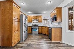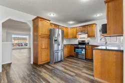 Welcome to this wonderful home in this fantastic neighborhood located walking distance to Sunshine and Emerson Lake!! Step through the front door and you will be welcomed by fresh paint and new flooring through most of the main level as well as a large entrance closet. The living room features large bright windows and a gas fireplace perfect for those chilly winter evenings!! The kitchen has plenty of working space a brand new stove and hood fan and dishwasher. The sliding glass doors lead out onto a covered deck perfect for evening bbqs. The back yard features a space for a trailer as well!! When you are back inside you will find an insulated garage main floor laundry and 3 good sized bedrooms and a 4 piece ensuite! This home also features AC!! Downstairs you will enjoy a large rec room, as well as 2 more bedrooms making this a 5 bedroom home!!! There is also another bathroom and plenty of storage in the basement! This home is a must see call your favorite agent today!
