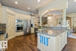 Located KINGSFORD CRESCENT ON A QUIET CUL-DE -SAC this custom built 4-bedroom 2000sqft great room bungalow with OVERSIZED TRIPLE CAR garage features over 3700SQFT OF AWESOME LIVING SPACE. From is stamped concrete driveway to its stunning stone exterior this home is impressive. Upon entering you are greeted by stunning custom millwork, hand scraped hardwood flooring, a main floor office/dining room and an expansive view of the great room with huge family room & feature wall fireplace, STUNNING GRANITE KITCHEN WITH ANTIQUED CABINETS, breakfast bar island, gas stove, built in ovens, pantry, S/S appliances, beverage fridge, loads of counterspace & a sundrenched dining nook. Additional features include: huge master bedroom with 6 pc ensuite, 2 person jacuzzi tub, glass block shower & walk in closet, HUGE RECREATION ROOM with feature wall fireplace, 3 additional large bedrooms, built in entertainment center, wet bar, games area, large laundry room, 9 foot ceilings, private patio all steps from RIVER LOT 56.