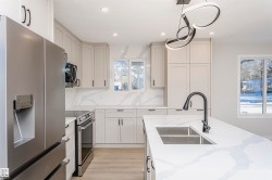LUXURY LIVING IN LACOMBE PARK! Nestled on a quiet, tree-lined crescent, this fully renovated 3-bed, 2-bath home has been completely updated top to bottom, inside & out, offering MODERN DESIGN in a bright open-concept layout. LVP floors flow throughout, leading to a chef-inspired kitchen W/ seamless QUARTZ counters & backsplash, grey shaker cabinetry, soft-close drawers, oversized uppers, WATERFALL island, recessed lighting, NEW SS appliances, & a stylish mini bar nook. The airy main level showcases a STRIKING electric fireplace / media wall. A CUSTOM MAPLE railing leads upstairs to a spacious primary retreat, 2 additional bedrooms, & a sleek full bath. The FULLY FINISHED basement boasts a large rec room & another DESIGNER 4 PC bath. Outside, enjoy an OVSZ HTD DBL GRG, fully landscaped EASY-CARE yard W/ NEW sod, deck, patio, PREMIUM vinyl siding, shingles, windows, roofline system, rubber asphalt driveway, & more! Steps to parks, schools, shopping, & transit. This TURN-KEY home is truly a rare opportunity!