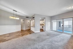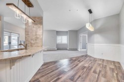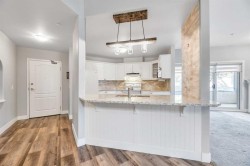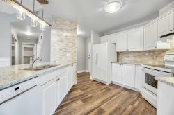 Welcome to this beautifully updated 2-bedroom plus den condo offering style, comfort, and convenience. The open floor plan is perfect for entertaining, featuring a bright living room with a cozy corner gas fireplace and access to the private balcony. The modern white kitchen boasts granite countertops and updated flooring, creating a fresh, contemporary feel throughout.The den with French doors provides the perfect space for a home office or reading nook. The spacious primary bedroom includes a walk-in closet and a 4-piece ensuite. A generous second bedroom, additional bathroom, and large laundry area add practicality and ease.This unit is immaculate and turn Key complete with A/C to add to comfort during the summer months!Enjoy the exceptional amenities this complex offers — including a library, recreation room, lounge, and gazebo — all designed to enhance your lifestyle. Large underground parking stall and a storage unit. Note-Building is 55+ a non smoking and no pet building--