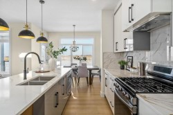 This Christmas, imagine unwrapping a brand-new custom home—one that backs onto endless green space. Welcome to 804 Lakewood Circle — a 2025 custom-built Shayman Homes luxury residence in Strathmore’s emerging lake community, Lakewood. This south-facing 5-bedroom, 3.5-bath home offers 2,200 sq. ft. above grade with a fully developed walkout basement, backing onto green space with unobstructed views of the future lake, pathways, and park.From the moment you arrive, the stone-accented exterior and architectural detailing set an elevated tone. Step through the custom glass-insert door into a bright vaulted foyer with an 8-ft closet and open sightlines that introduce the home’s modern, elegant design. A main-floor office with oversized windows provides an ideal workspace.The open-concept main level features 9-ft ceilings and upgraded 9-inch luxury vinyl plank flooring. The chef’s kitchen is anchored by a 9-ft quartz island with a built-in stainless-steel microwave and dishwasher, complemented by a gas stove with hood fan, stainless-steel fridge with water hookup, undermount sink, quartz counters, and soft-close cabinetry with black hardware. Six-foot windows fill the space with natural light, highlighting the floor-to-ceiling tiled gas fireplace in the living room. The covered upper deck with glass railings and a gas line extends the living space year-round.A custom walk-through pantry with built-in shelving leads to the mudroom, complete with a built-in shoe rack, coat hooks, and full closet—perfect for busy families. Direct access to the oversized double garage, with a gas line rough-in and side entrance, makes winter days and grocery runs effortless.Upstairs, a vaulted bonus room offers a bright, inviting family retreat. The upper laundry room includes tile flooring and a quartz folding counter. The serene primary suite features large windows and a spa-inspired ensuite with a dual quartz vanity, soaking tub, fully tiled shower, separate toilet room, and walk-in closet. Two additional spacious bedrooms—one with a walk-in—share a beautifully finished four-piece bathroom.The fully developed walkout basement continues the high-end feel with 9-ft ceilings, luxury vinyl plank flooring, and abundant natural light. A generous family room transitions to a 10-ft wet bar with quartz counters, tile backsplash, under-cabinet lighting, custom cabinetry, and built-in wine storage—an entertainer’s dream. Two bright bedrooms, a full four-piece bath, mechanical room, and storage complete the level. Step outside to a covered concrete patio and landscaped yard with chain-link fencing on the park side and wood privacy fencing along the neighbour’s lot.This is a rare opportunity to own a brand-new, custom lake-community home with luxury finishes, thoughtful design, and exceptional indoor-outdoor living. 804 Lakewood Circle offers the perfect blend of privacy, nature, and modern comfort—ideal for families seeking long-term value in one of Strathmore’s most exciting new neighbourhoods.