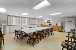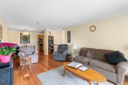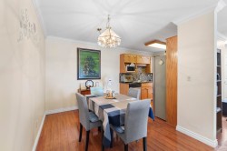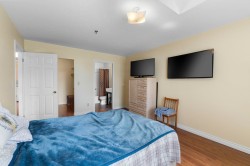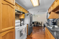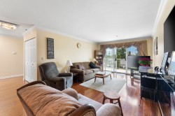 Top-floor charm in Central Heights Manor! This bright 2 bed, 2 bath condo welcomes you with a skylit foyer and stylish laminate floors throughout. Enjoy formal living and dining spaces with elegant crown moulding, rich draperies, and a cozy wall-mounted electric fireplace. Step into the sunny south-facing deck through sliding glass doors. The galley kitchen features sleek stainless steel appliances. Relax in the spacious primary bedroom with vaulted ceilings, walk-in closet, and 4-piece ensuite. The second bedroom is ideal as a guest room, office, or den. In-suite laundry with extra storage, 2 storage lockers, and a secure underground parking stall, and great amenities that include a gym, games room, workshop, art room, coffee area, guest suites, BBQ pit, and a community piano!