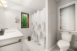 Charming mountainside home featuring breathtaking coastal mountain & ocean views. Set upon a private lane & mere steps away from the shops, cafes & services of Artisan Square. The community shuttle will also whisk you to/from the many amenities of Snug Cove & ferry. You are greeted by a covered porch and a lovely side garden that leads you to a back terrace perfect for barbecues or lounging. A concrete pad in place allows for an auxiliary structure (office, greenhouse). The first floor features a generous sized family room with fireplace for cozy nights along with a bedroom & bathroom. The upper level boasts an open plan. Primary bedroom on this level leads to a covered deck. Recently updated roof (50 yr warranty), bathrooms & kitchen, outfitted with Bosch, Fisher & Paykel appliances.