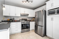 Charming 3 bed, 2 bath townhome in a quiet, family-friendly neighbourhood close to schools, recreation, shopping & transit. Bright open-concept main floor with spacious kitchen featuring newer SS appliances (2022), modern countertops & soft-close cabinets, flowing into the living area with cozy gas f/p. Upstairs boasts a large primary bedroom with ensuite access to a 5pc bath w/dual vanity, plus 2 more bedrooms & laundry. Recent updates: HWT & roof (2018), W/D (2021), dbl garage w/new door. Move-in ready & perfect for families!